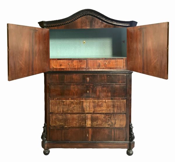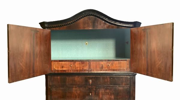 piedi a cipolla e sculture applicate agli angoli. Corpo superiore con due sportelli e cimasa modulata con cornice ebanizzata nera, sottolineata da appallottolato. Interno con vano centrale provvisto di due cassetti alla base. Provenienza Sicilia, ottime condizioni.