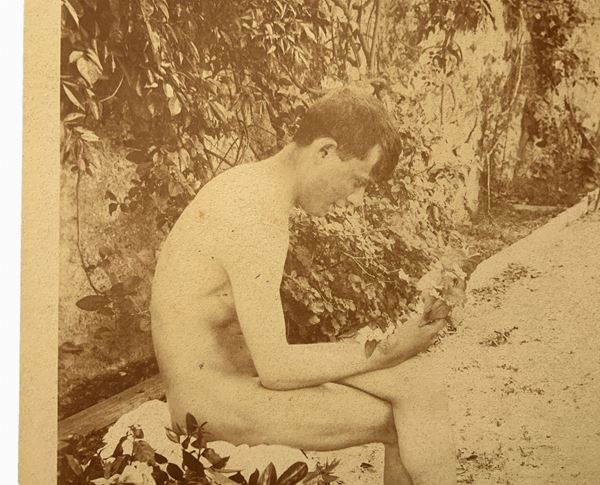 Nudo di ragazzo seduto con fiori alla mano