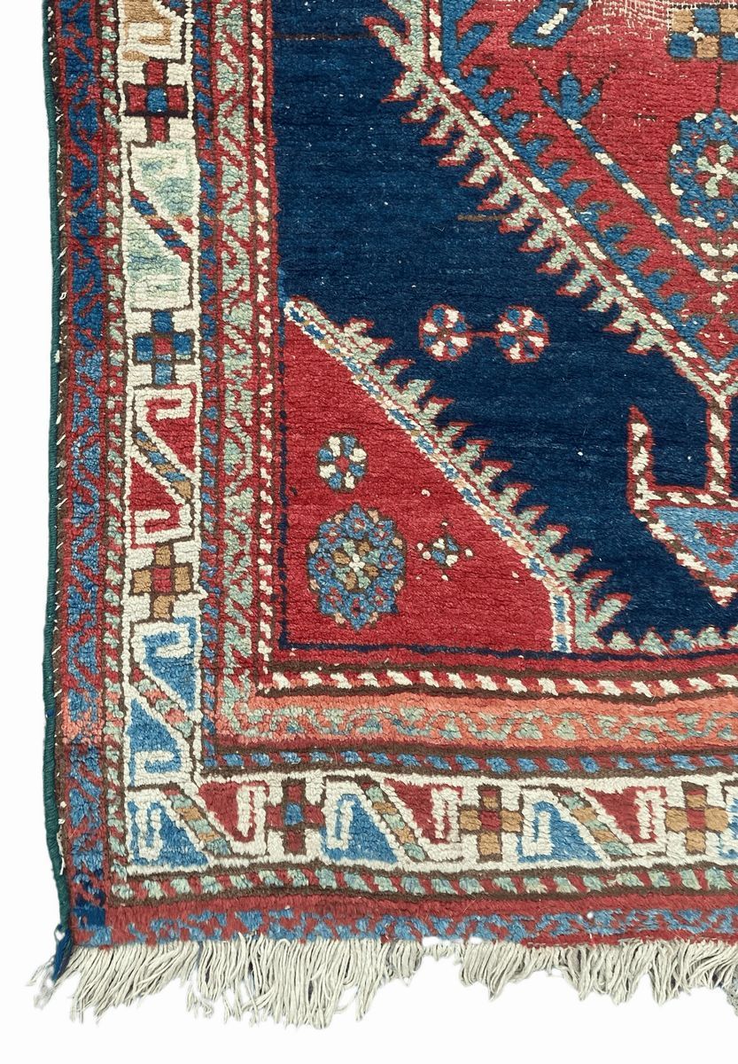 nei toni del rosso e del blu con cinque esagoni centrali.