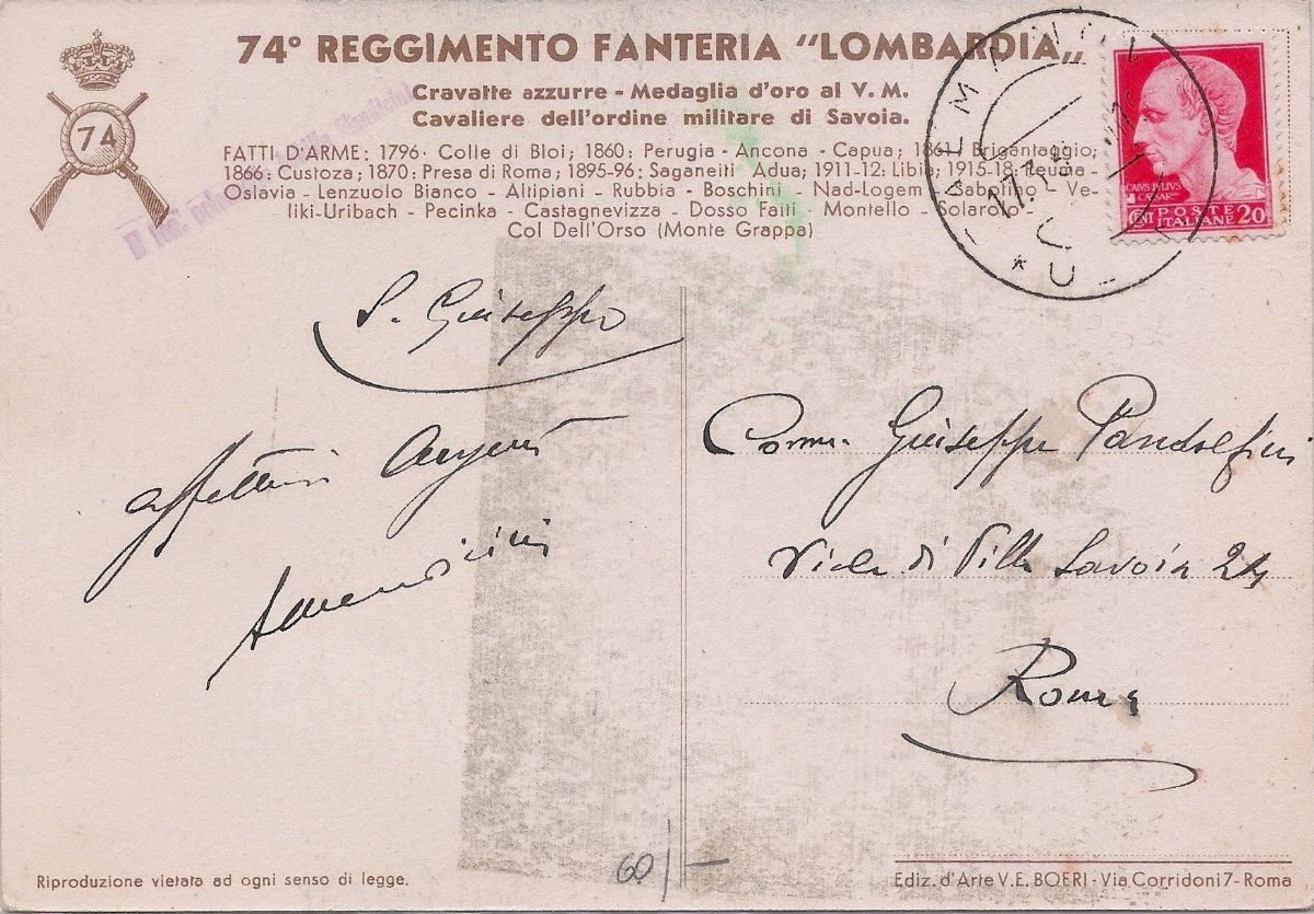 Cartolina originale 74esimo reggimento di fanteria Lombardia, 1940 c.a.