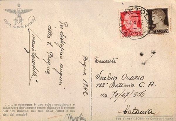 Conquistare e conservare dovunque e contro chiunque il primato dell'Ala Italiana nei cieli della Patria e nei cieli del mondo!Viaggiata a Pasqua del 1942. Edizione d'arte V. E BOERI