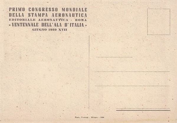 Ispirata al volo 1938. sul retro Primo congresso mondiale della stampa aeronautica - ventennale dell'ala d'Italia. Non viaggiata. Illustratore Derrico.