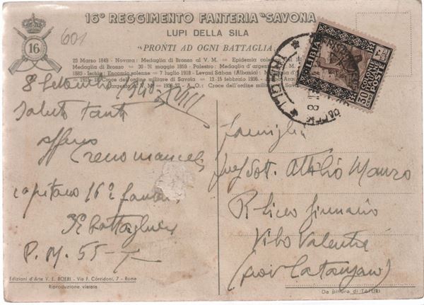 Sedicesimo reggimento fanteria Savona. Lupi della Sila. Viaggiata nel 1940. Ediz. d'arte V.E. Boeri. Dipinto di Clemente Tafuri (Savona 1903 - 1971).