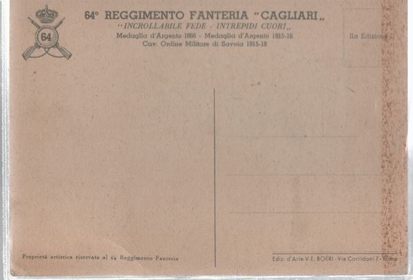 Cartolina originale 64° reggimento di fanteria "Cagliari: incrollabile fede, intrepidi cuori"