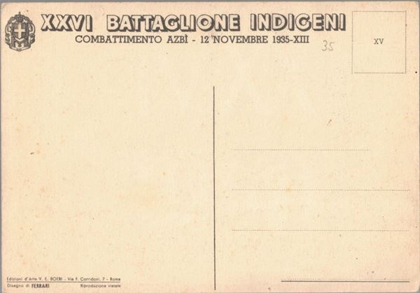 Cartolina originale coloniale XXVI battaglione indigeni - il paradiso è all'ombra delle nostre spade - combattimento Azbi 12-11-1935