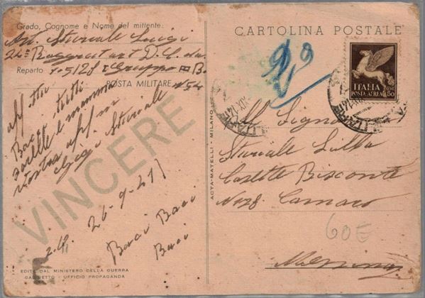 La Casa d'Aste Art La Rosa offre in vendita cartoline delle dittature della II Guerra Mondiale solo ai fini dell'educazione civica e della difesa contro atti incostituzionali o anti costituzionali, della ricerca storica, scientifica e storico militare. L'offerente si impegna ad acquistare tali opere per motivi storico scientifici e per quelli sopra citati e non per scopi propagandistici.