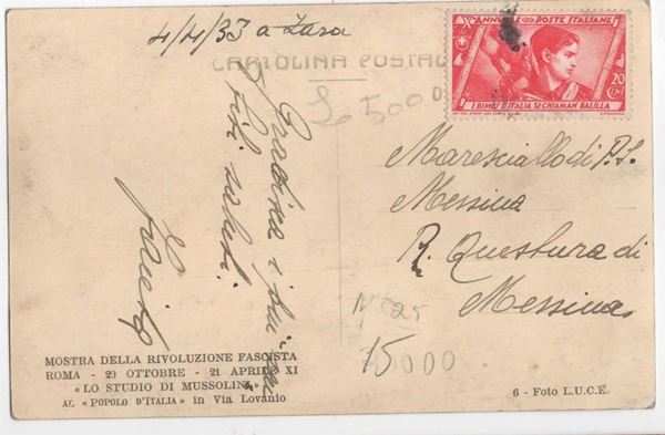 La Casa d'Aste Art La Rosa offre in vendita cartoline delle dittature della II Guerra Mondiale solo ai fini dell'educazione civica e della difesa contro atti incostituzionali o anti costituzionali, della ricerca storica, scientifica e storico militare. L'offerente si impegna ad acquistare tali opere per motivi storico scientifici e per quelli sopra citati e non per scopi propagandistici.€ 15,00
