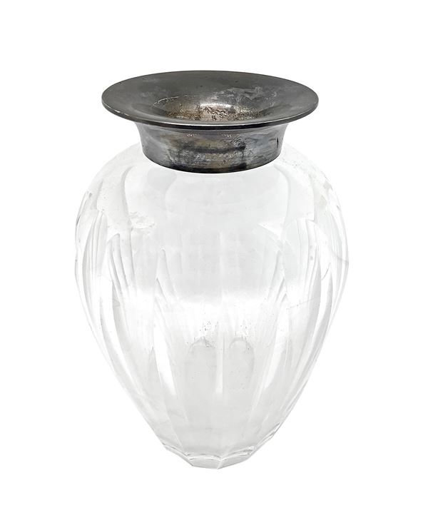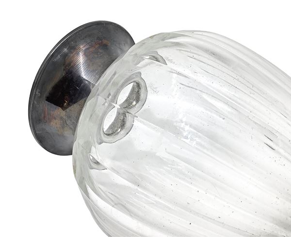 Vaso in vetro pesante costolato con bocca argentata, 1920 circa