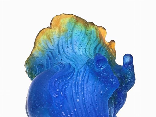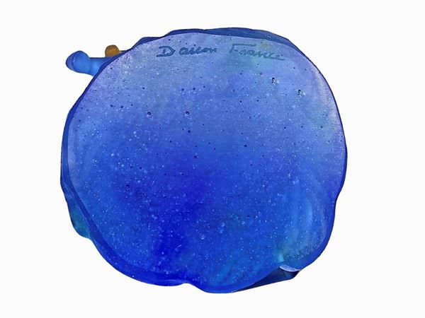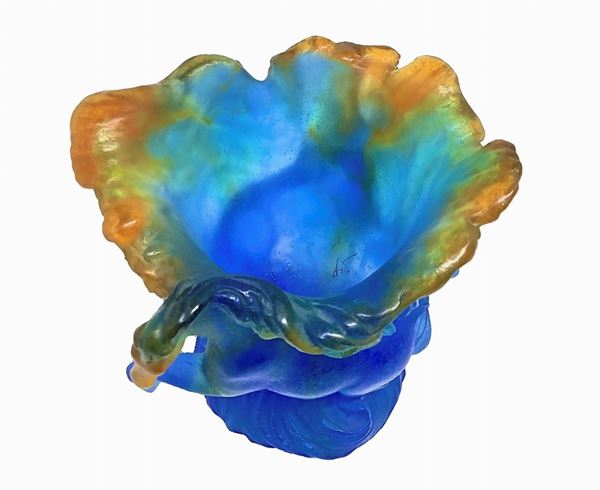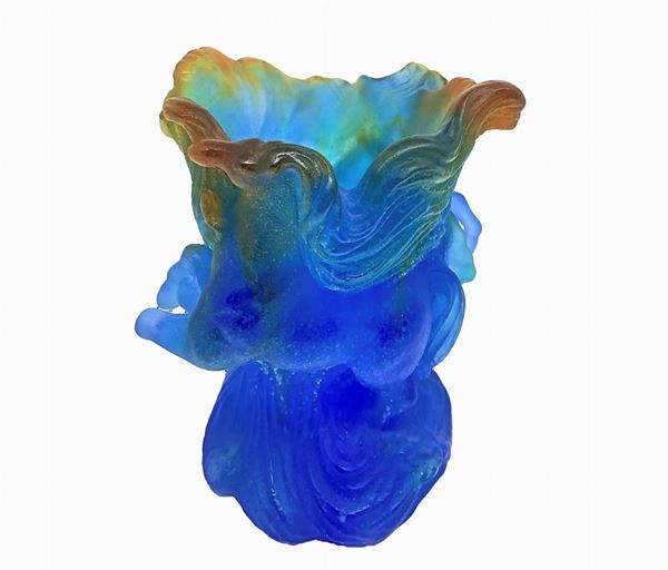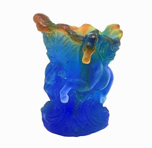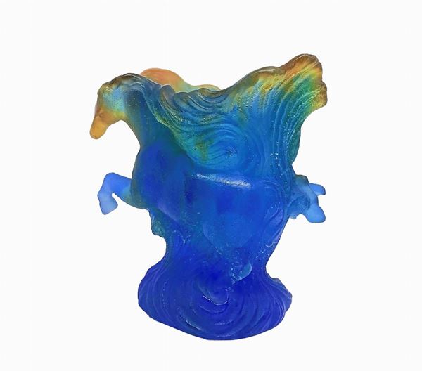Pate de Verre Timbale Chevaux de Marly Bleu Horse Vase MIB. Daum vaso con cavalli e sfumature blu, verdi e ambra. Piccola mancanza nello zoccoletto di un cavallo. Firma alla base.