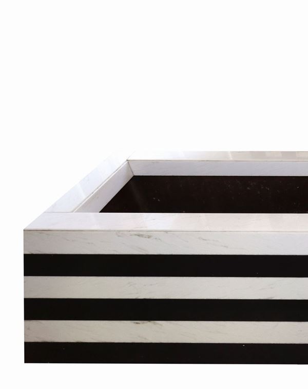 Struttura a fasce in marmo a strisce bianco lasa cavelano e nero assoluto, interno zincato, base con rotelle.