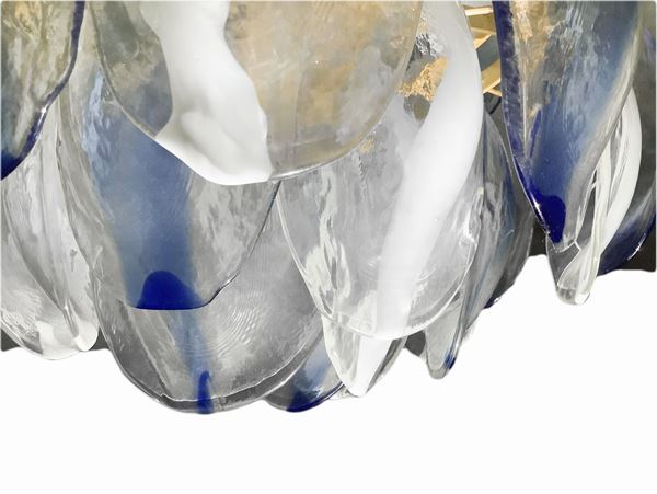 Struttura in metallo laccato bianco, con placche ovali di vetro colorate a forma di pigna, elementi in vetro trasparente con superficie effetto ghiacciato ed inclusioni di pasta vitrea nei toni del bianco e del blu, incompleto-mancanze