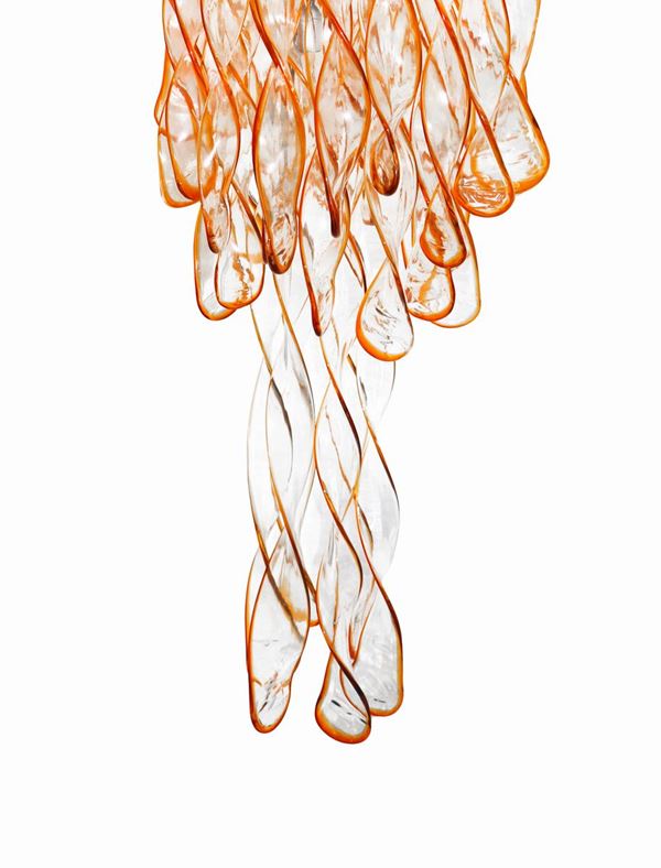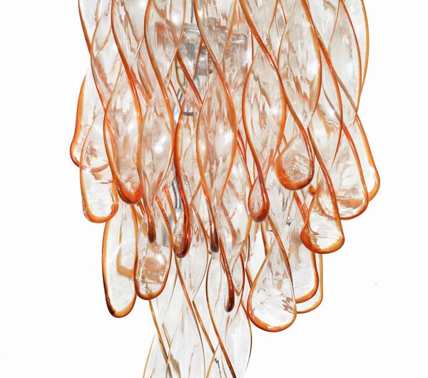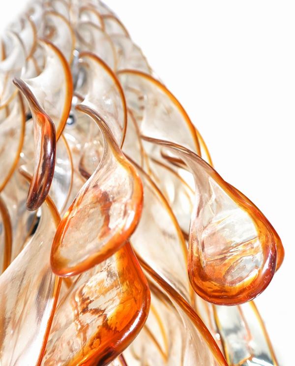 Con struttura in tondino metallico cromato di forma circolare disposto su più ordini ed elementi in vetro torchon trasparente con finiture lungo i bordi nei toni dell'ambra