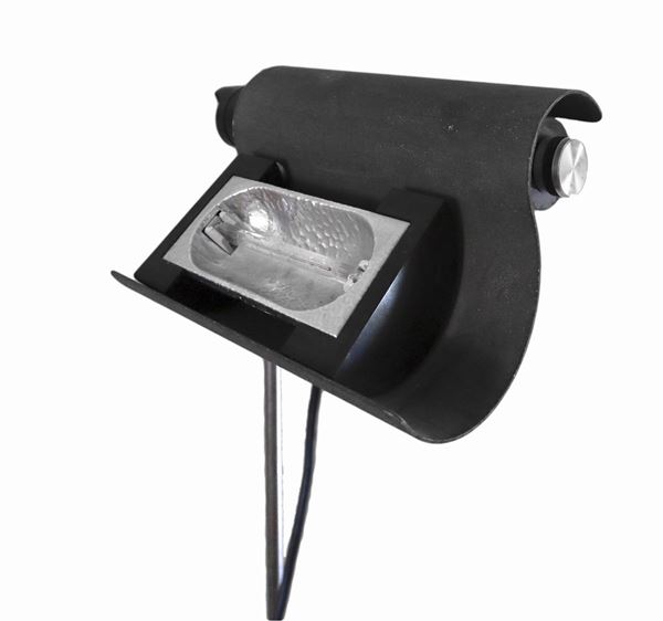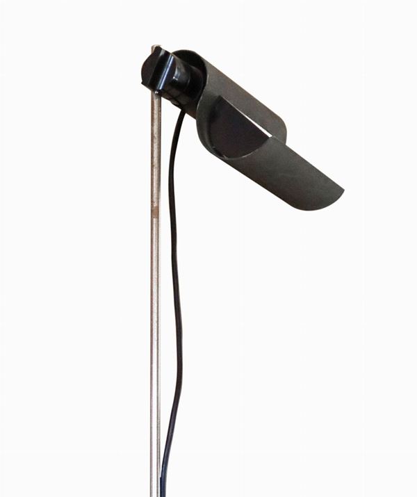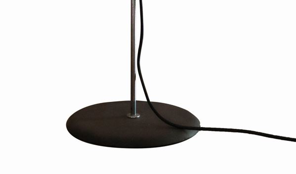 Design Vico Magistretti, asta cromata su base in metallo nero con diffusore a forma di onda in cui è inserito il vano della lampadina posizionabile in tutte le direzioni e ruotabile sulla base