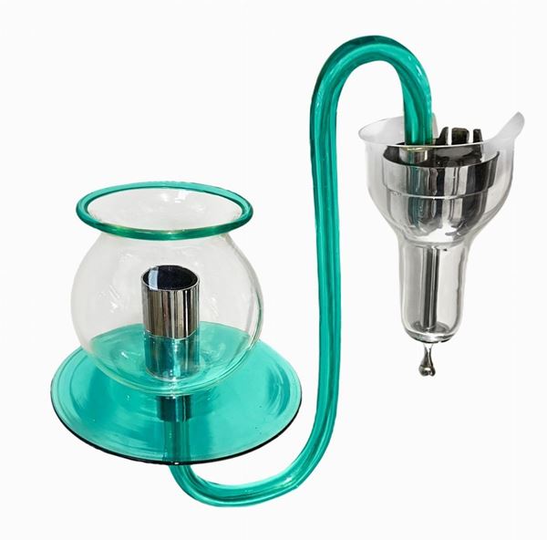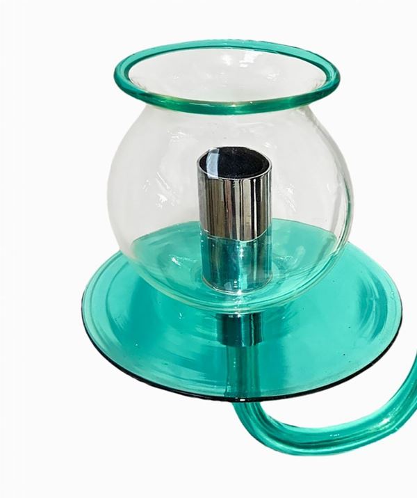 Copri supporto e diffusore in vetro soffiato trasparente con applicazioni in pasta vitrea nei toni del verde, braccio a volute e piattino controdiffusore in vetro soffiato nei toni del verde smeraldo.