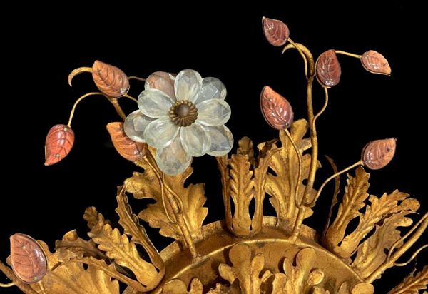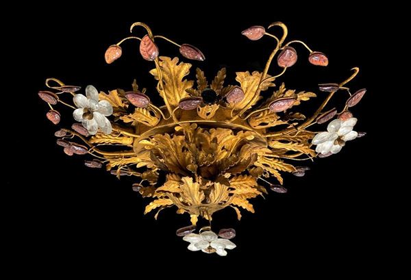 Plafoniera a soffitto, 15 luci a soffitto in metallo dorato con cristalli molati bianchi e ametista.