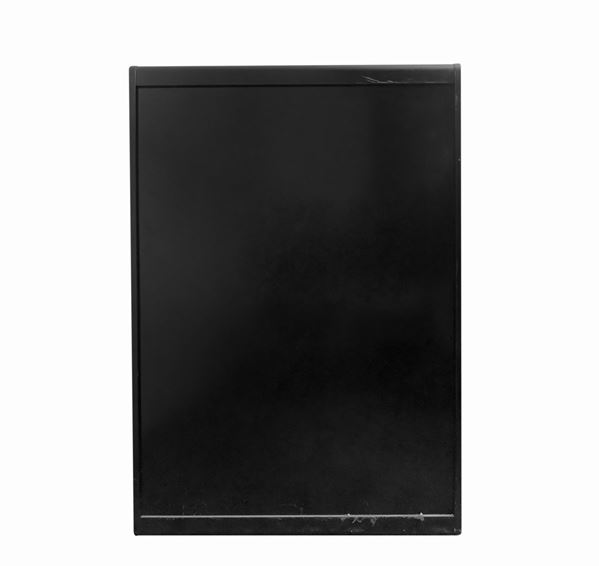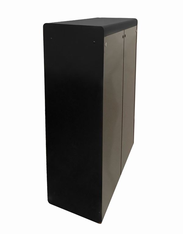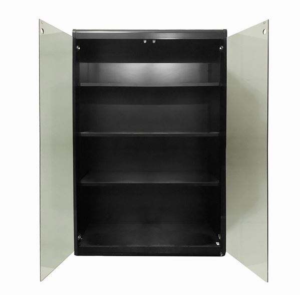 Struttura in legno laccato nero ebanizzato, ante in vetro fumè. Segni d'uso, presente etichetta dell manifattura