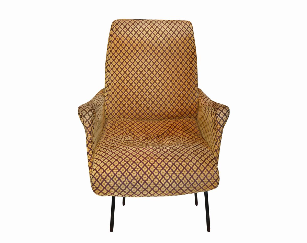 Spalliera reclinabile e piedi a scomparsa. Tessuto originale del periodo nei toni dell senape riportante motivo a losanghe. Segni di uso.