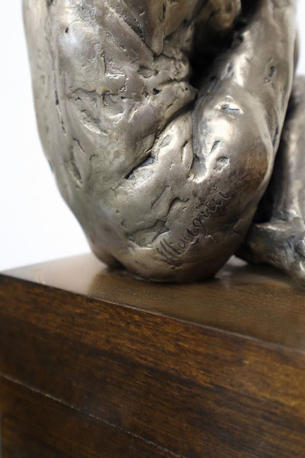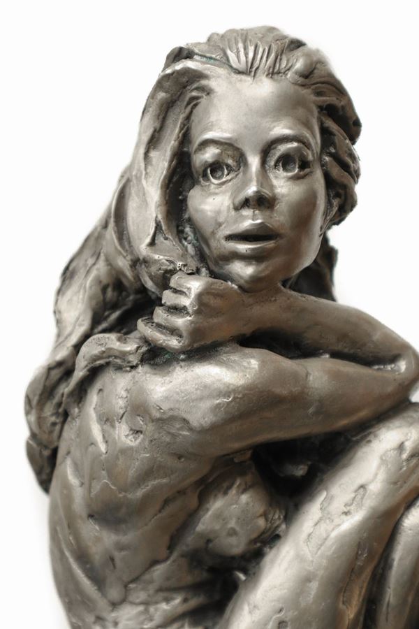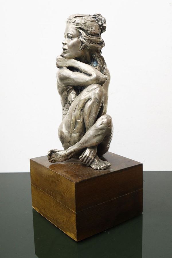 Scultura in bronzo di donna accovacciata, patinata in antracite-verde
