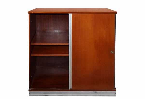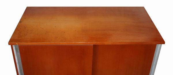 Con ante scorrevoli e dettagli in alluminio satinato. Interno con mensole. Presenti segni d'uso