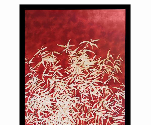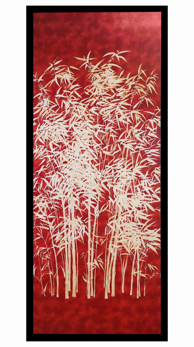 Pannello in tela raffigurante steli di bamboo su fondo rosso