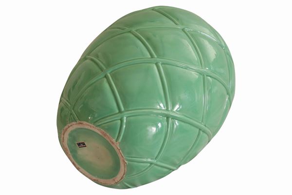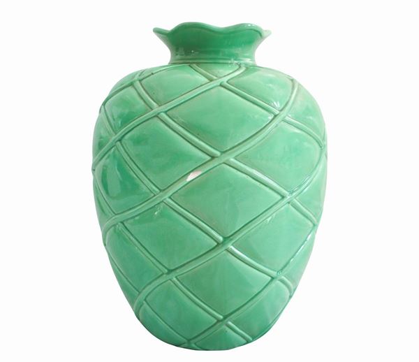 Produzione italiana nello stile di G. Gariboldi. Vaso nei toni del verde acqua. Riportante decoro a sbalzo raffigurante losanghe lungo la superficie. Collo estroflesso a guisa di fiore. Presente piccola sbeccatura