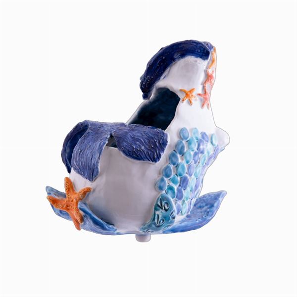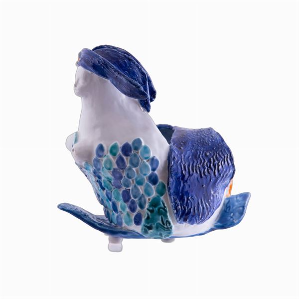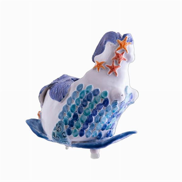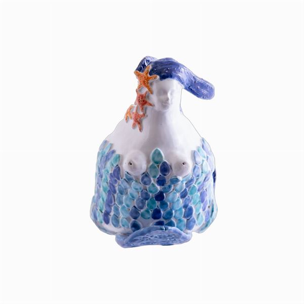 Figura in ceramica lavorata a mano con inserti in rilievo.