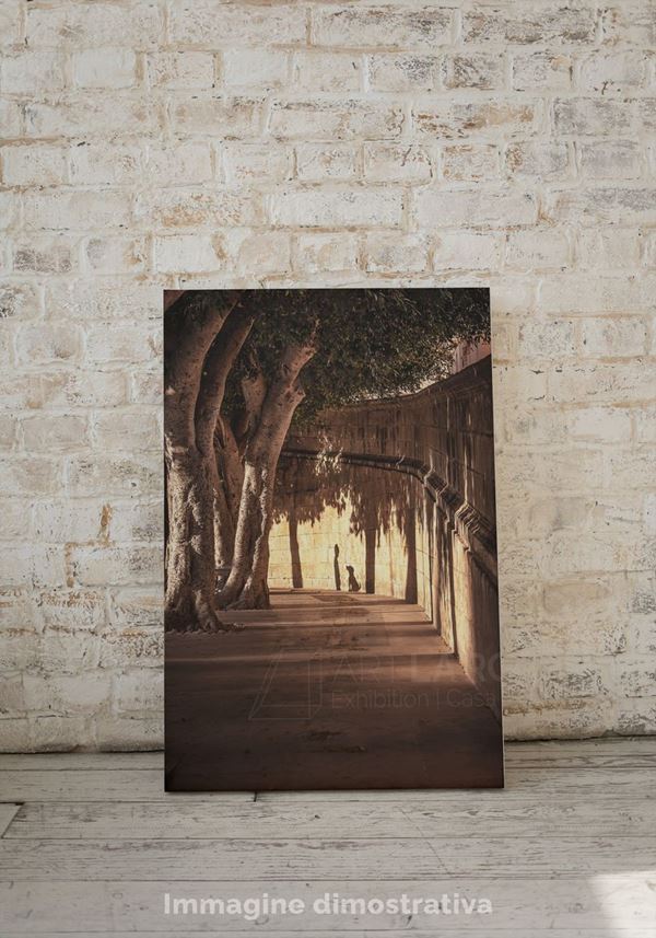 Silhouette di bimbo e cagnolino proiettate su una parete di piazza Landolina, Noto (SR).