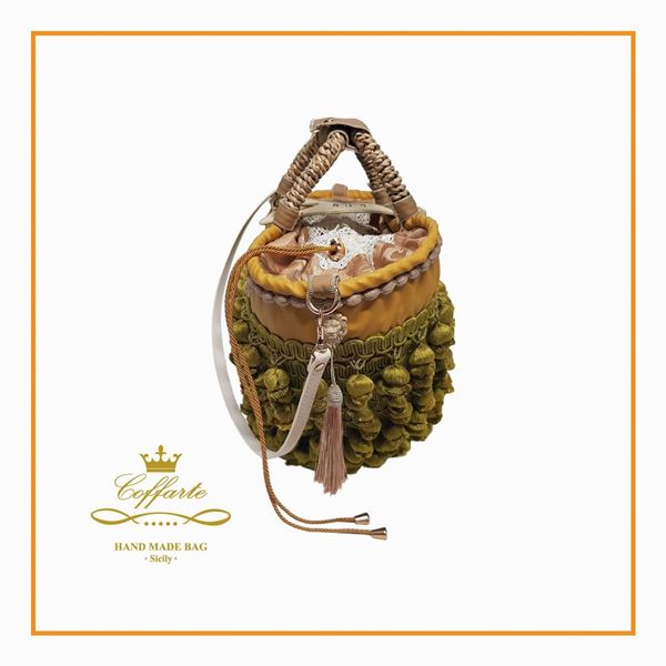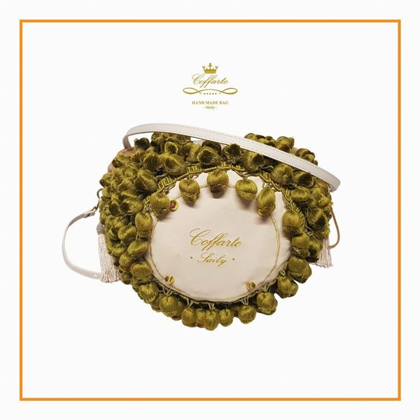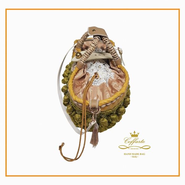 Rivestimento in passamaneria a cipollina ed ecopelle, con marchietto coffarte e arricchita da inserti in pietra naturale e incisa, con pietra raffigurante testa di medusa e teste di leoni laterali con relative nappine pendenti. Utilizzo multiuso, a manico e tracolla regolabile e rimovibile. Chiusura a sacco e a campana.