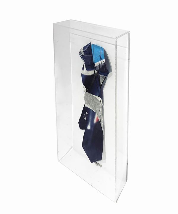 Opera accompagnata da autentica su fotografia a cura della Galleria d'Arte Rotta Farinelli, Genova e da lettera autografa di accompagnamento scritta. Provenienza Collezione Fabrizio Boggiano, Genova (timbri al retro). Esposizioni: Ties for art, Boutique Valentino via dei Tosinghi Firenze; 13- 31 gennaio 2001, Cravatte d'Artista, Reali Arte Cotemporanea, Sala SS Giacomo e Filippo, Brescia; 19 luglio- 6 agosto 2000, Cravatte d'Artista, Complesso Monumentale Fortezza del Priamar, Savona; 22 dicembre 1998- 7 gennaio 1999, Collezione Boggiano, Nodi d'Artista sale espositive ex Ospedale Militare, Alessandria. Bibliografia: AA.VV. Ties for art - Valentino, catalogo della mostra per l'apertura della boutique Valentino, via dei Tosinghi, Firenze, n. 14 (ill.); AA.VV. Collezione Antonella e Fabrizio Boggiano. Cravatta d'artista, catalogo della mostra presso il Complesso Monumentale Fortezza del Priamar, Savona 2000, s.p. (ill.); F. Boggiano, E. Bonessio di Terzet, Collezione Boggiano. Nodi d'artista, il Cobold Editore, Genova, 1998, s.p. (ill.)