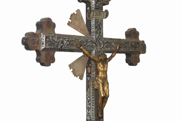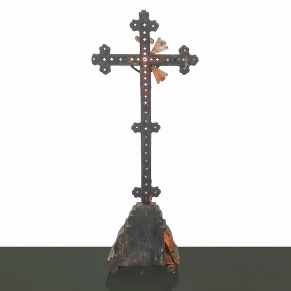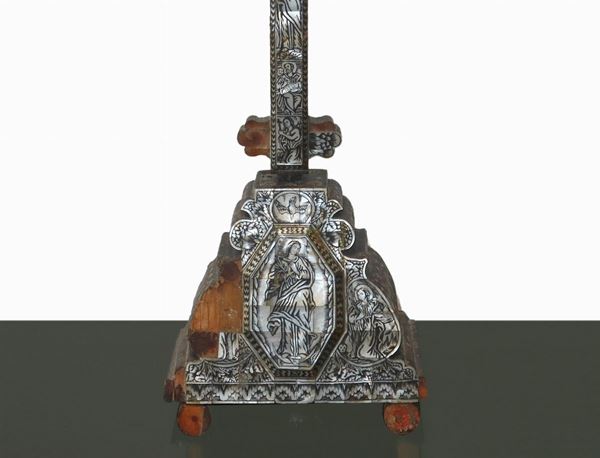 Crocifisso legno con piedistallo, lastronato in madreperla decorata a bulino con figure sacre, XVIII secolo