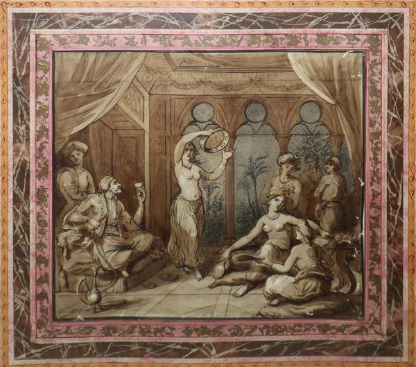 Interno di harem con donne in cornice di legno dorato, XIX/XX Secolo