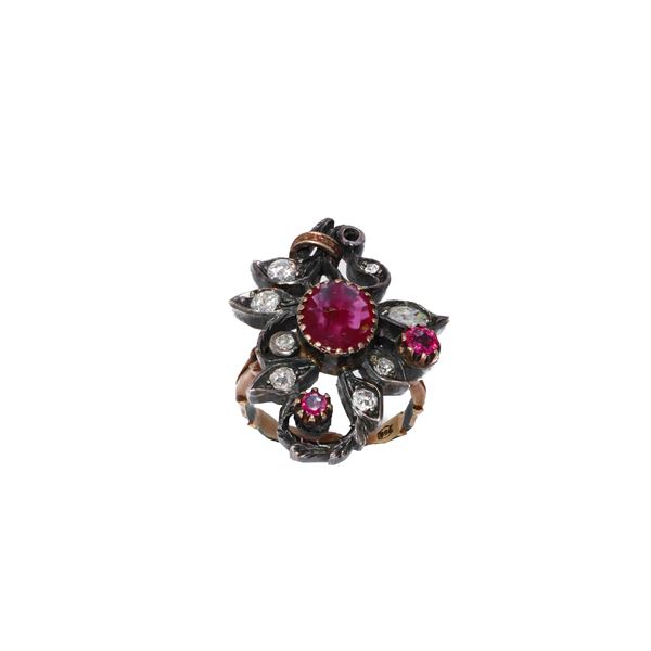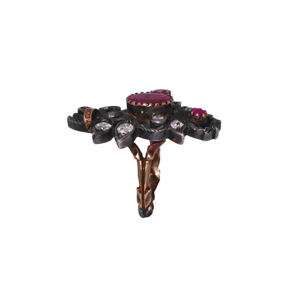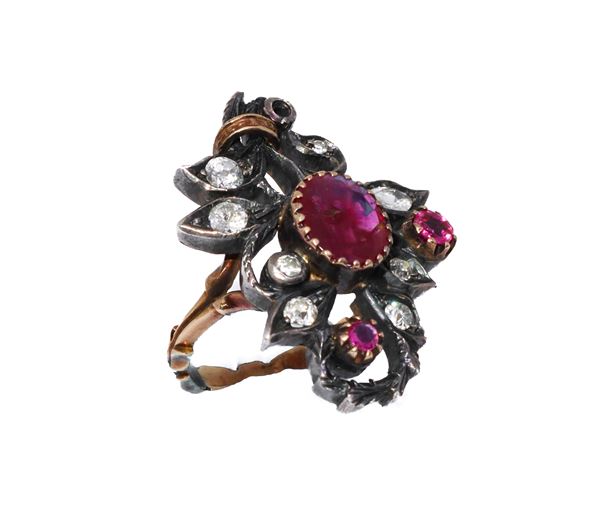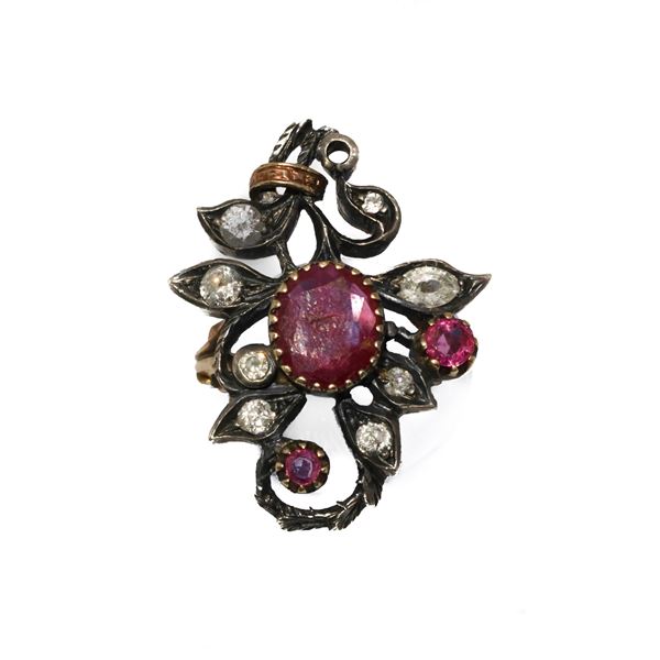 Raffigurante tralcio, con dimamenti e rubini. Lieve difetto alla pietra centrale.