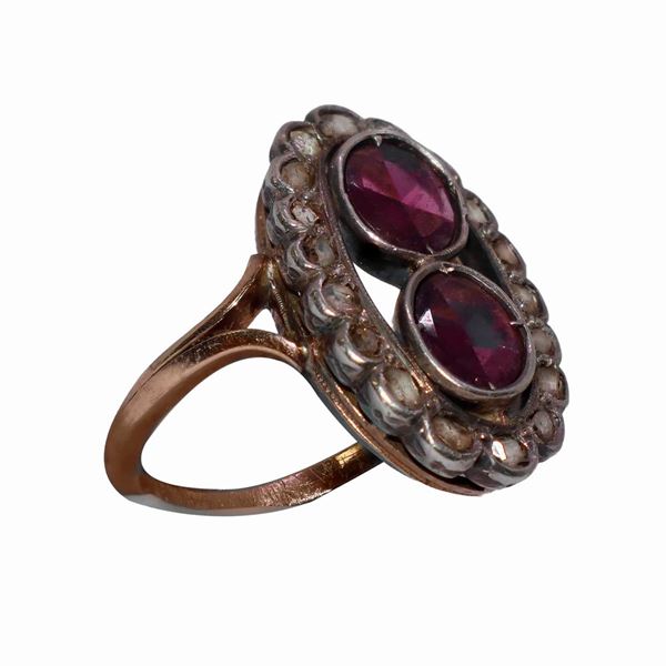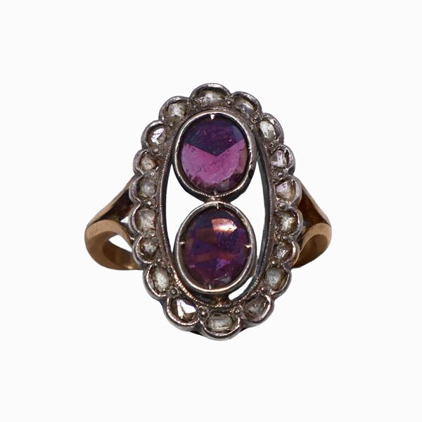Anello in oro 18 kt , argento e 2 tormaline ovali girato da diamanti, fine XIX secolo