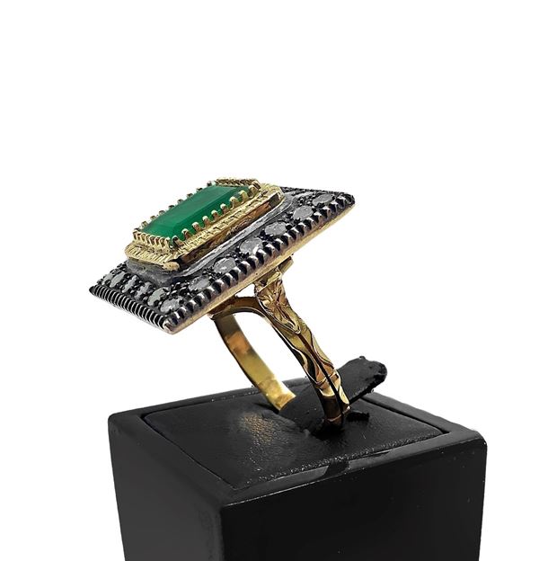 Anello in oro e argento con rosette di diamanti e radice smeraldo centrale