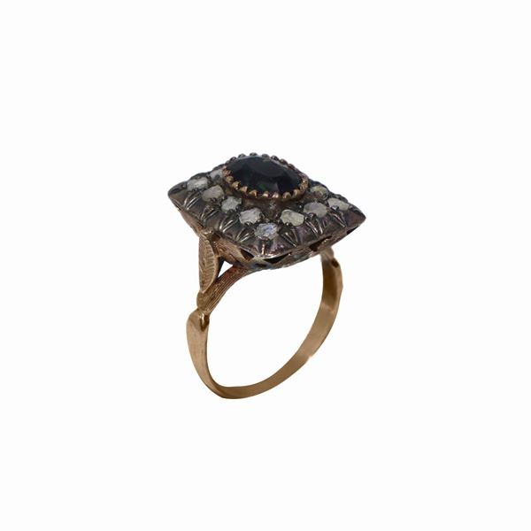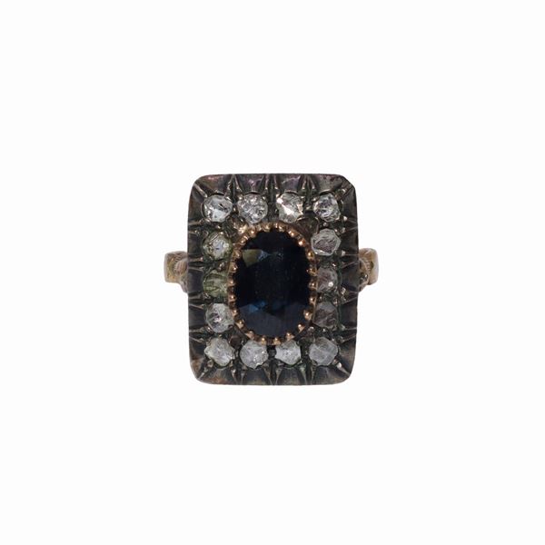 Anello in oro e argento con zaffiro centrale e rosette di diamanti