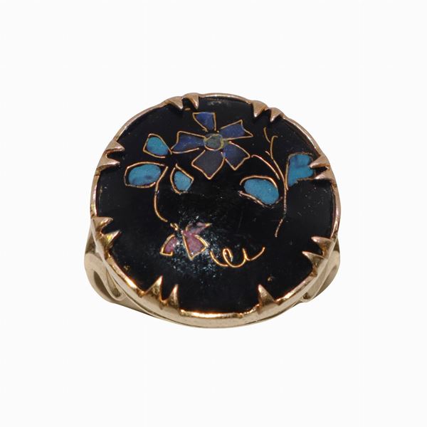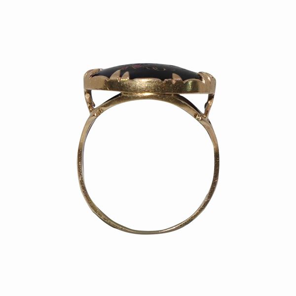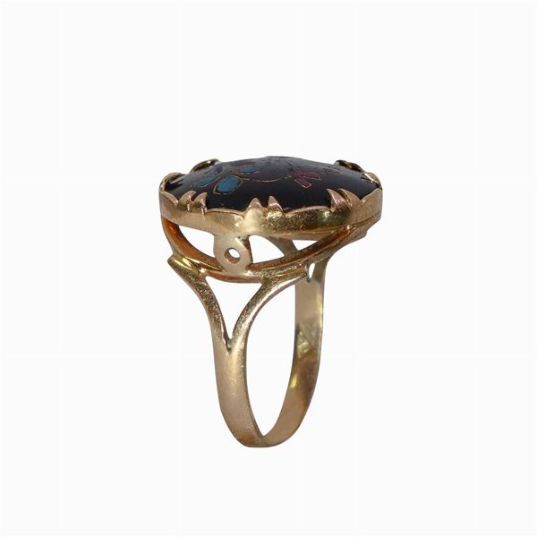 Anello in oro giallo 18 kt ,onice ed intarsi floreali in pietre dure