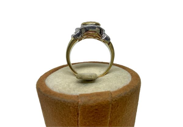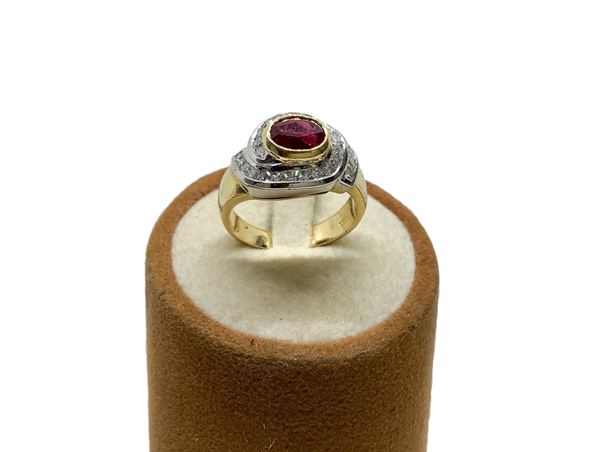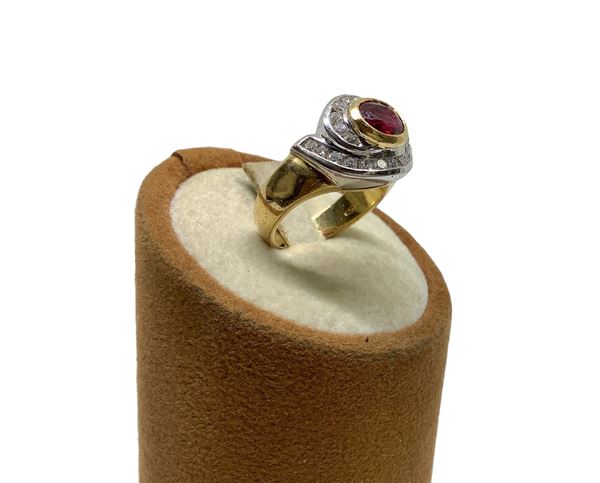 Anello in oro giallo e bianco, centrale di rubino e corona di brillanti