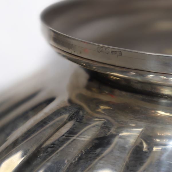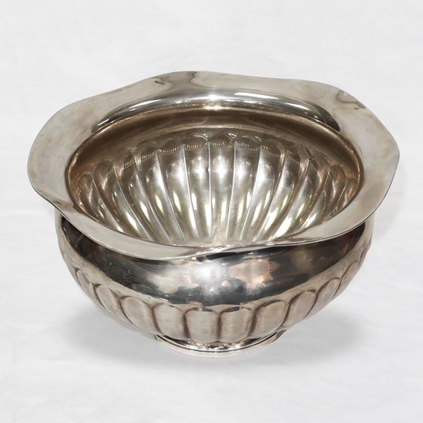Centrotavola a coppa in argento, con decorazioni sbalzate a lobi.