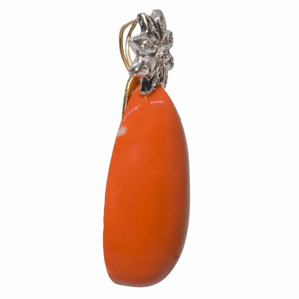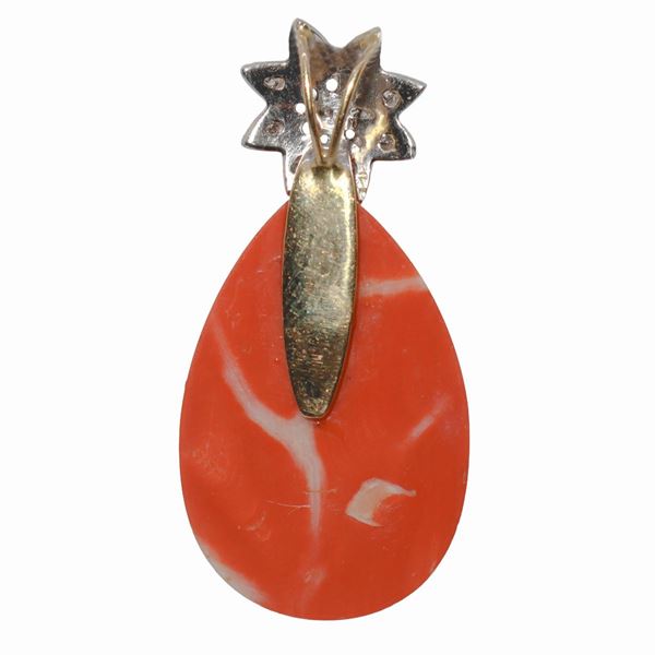 Ciondolo in oro bianco 18kt e brillantini, con corallo a mandorla