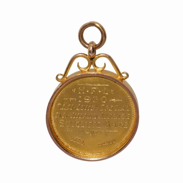 Ciondolo medaglia, montatura in metallo, moneta in oro 9 kt datata 1930