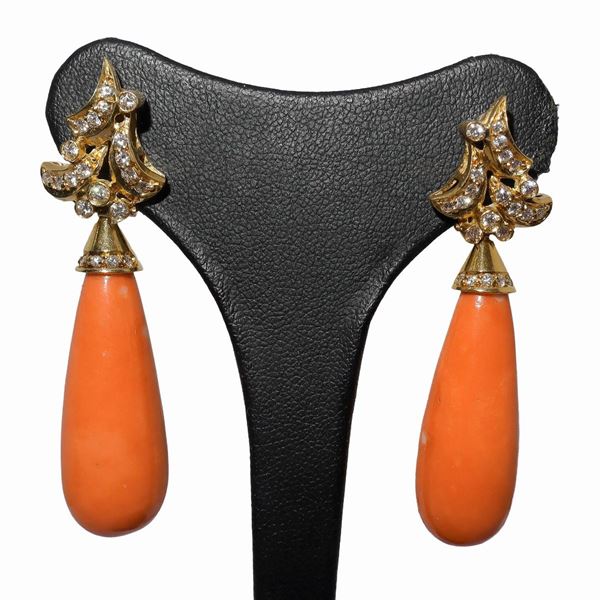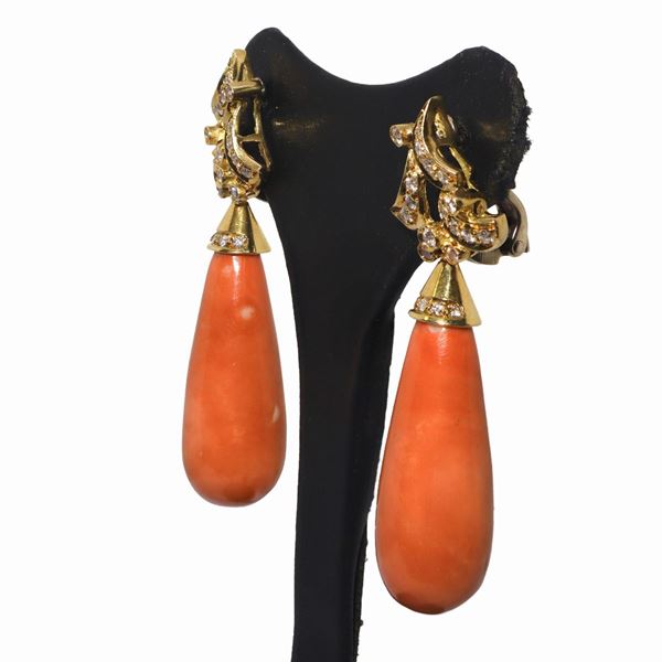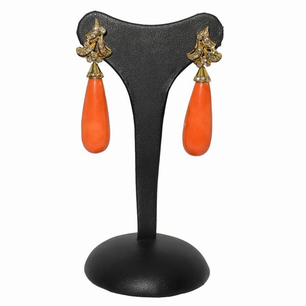 Orecchini in oro 18kt con brillanti 0,50 ct e coralli a goccia