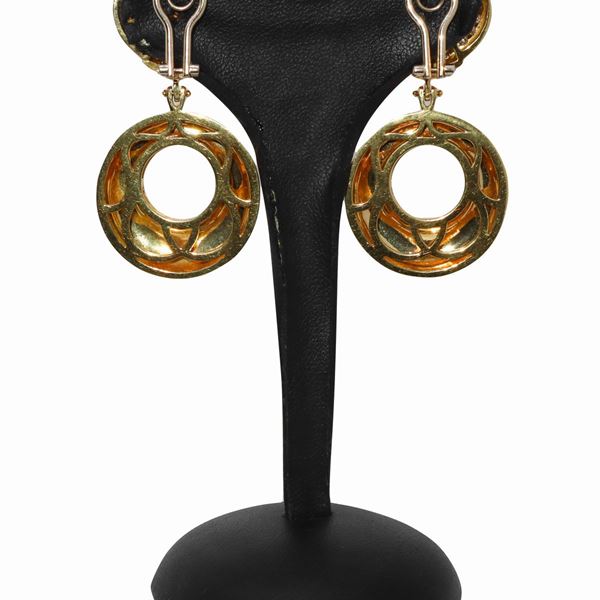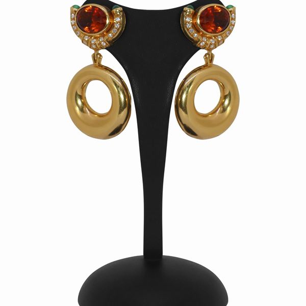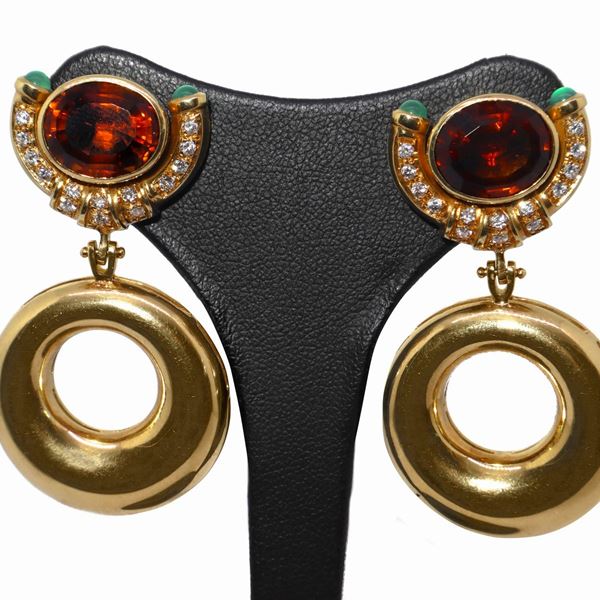 Orecchini in oro giallo 18 kt, topazio madeira, smerladi cabochon, diamanti taglio brillante 0,86