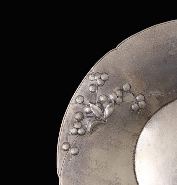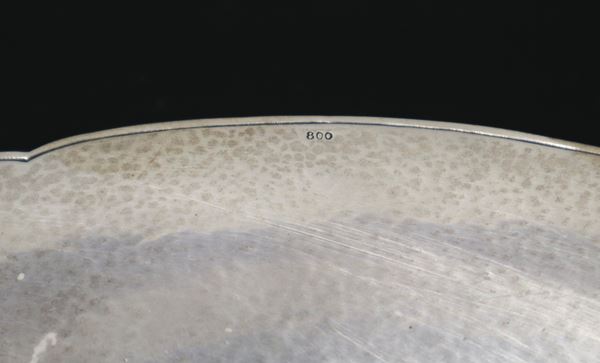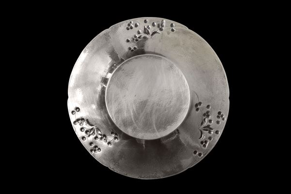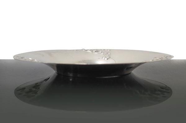 Piatto in argento 800, sbalzato a motivi floreali, XX secolo