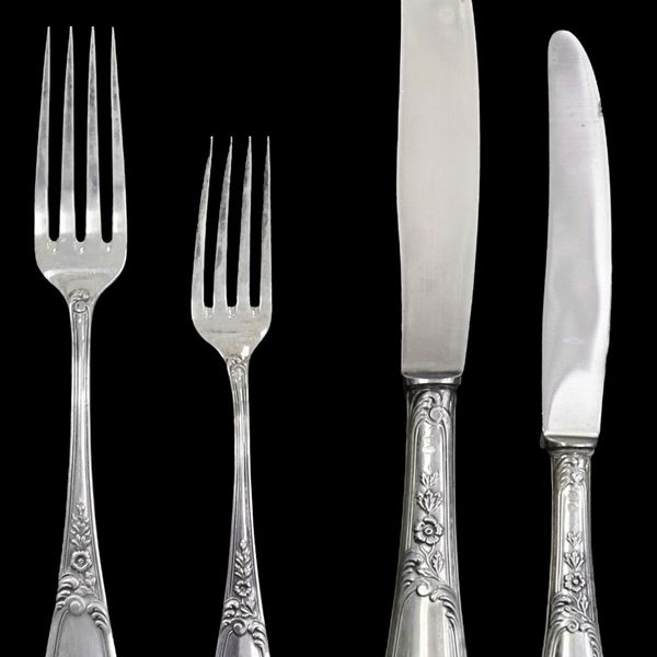 Composto da 24 forchette, 12 coltelli, 12 cucchiai, 12 forchettine frutta, 12 cucchiaini dolce, 12 coltelli frutta, 1 mestolo