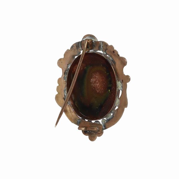 Spilla in oro a basso titolo con commesse di pietre dure a mosaico con motivi floreali.