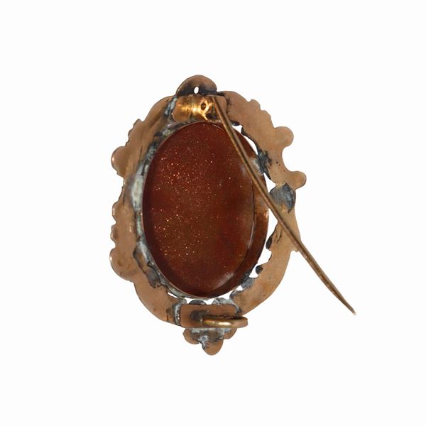 Spilla in oro a basso titolo con commesse di pietre dure a mosaico con motivi floreali.