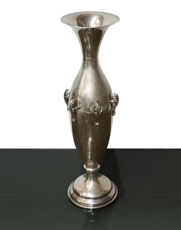 Vaso ad anfora in argento 800, con applicazioni a sbalzo.