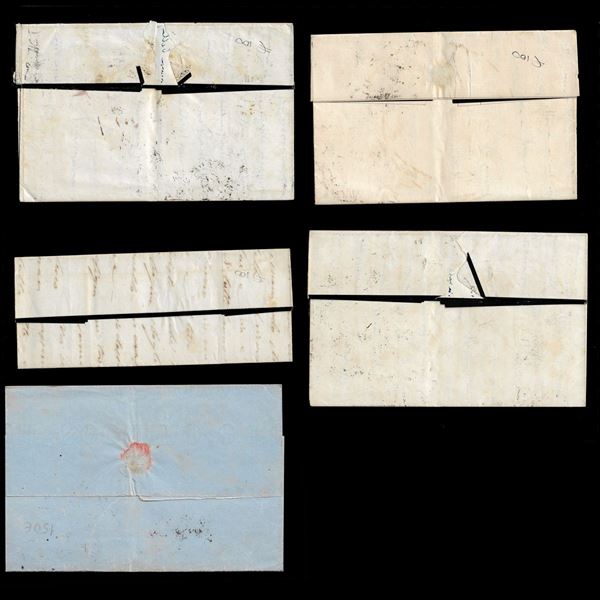 1858, 6 cr. Azzurro cupo (15b), 5 esamplari di II scelta su altrettante lettere da Livorno per Catania. Da esaminare.