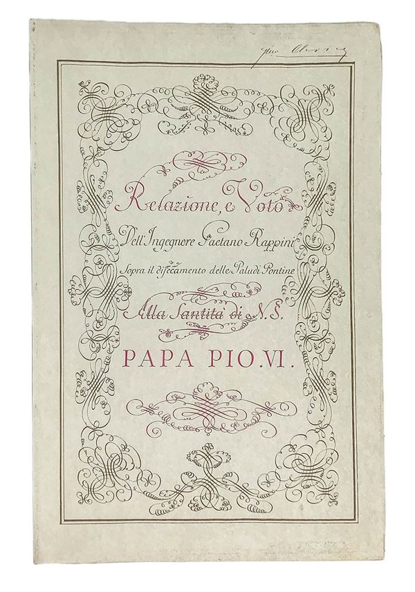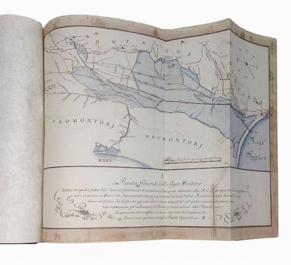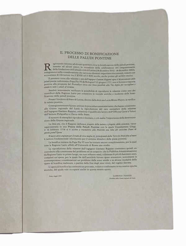Relazione e Voto dell’ingegnere Gaetano Rappini sopra il disseccamento delle Paludi Pontine alla Santità di N.S. Papa Pio VI, Roma 1983. In folio tela ornata in oro, 42 pagine, 55 tavole a colori di qui 21 pieghevoli 1 carta inserita. Facsimile del manoscritto dell'ing. Rappini (1734-1796). Ottimo stato.