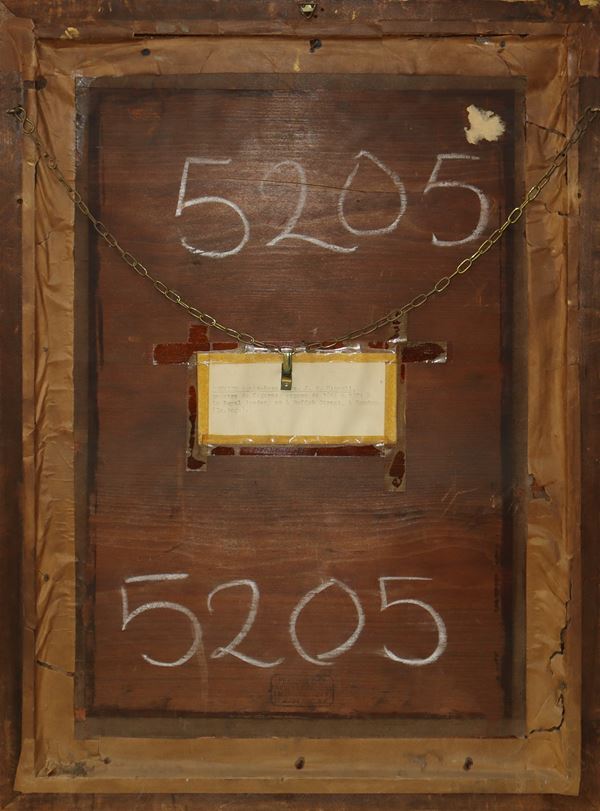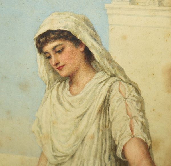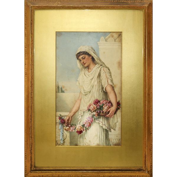Firmato in basso a destra. Etichetta al retro "Bouvier Agnes Rose, Mrs J. S. Nicholl. peintre de figures; expsose de 1866 à. 1874 à.  la Royal Academy et à Suffok Street. à Londond". Timbro Pearson & Son al retro.